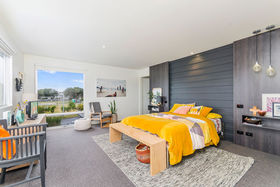 - Master bedroom with timber feature wall and lovely corner glazing
