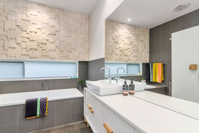 - The bathroom, with bath and in situ shower, boasts sandstone 3D tiles and a floating vanity
